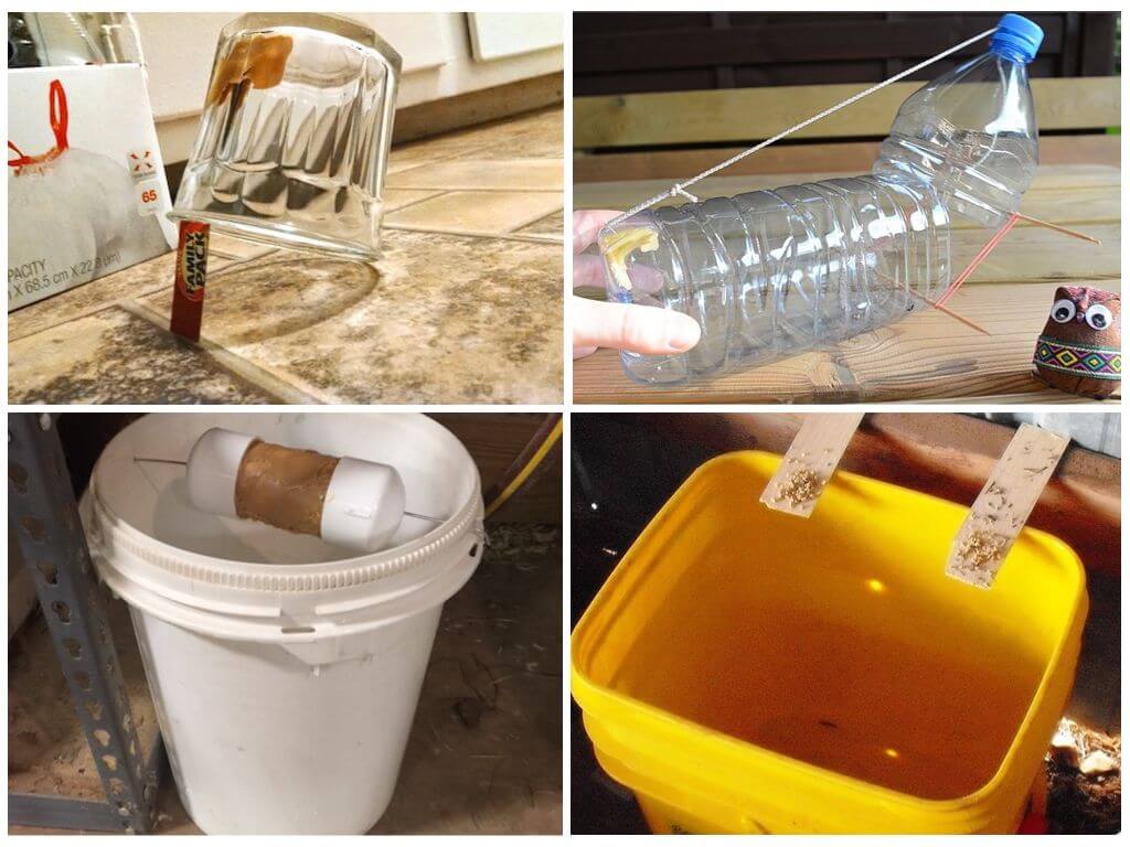 - Чтобы поймать мышь в доме, можно сделать ловушку из ведра с вертящейся бутылкой: для этого понадобится пластиковая бутылка на 0,5 л, которую нужно проткнуть спицей насквозь через дно и крышку. Спицу необходимо закрепить наверху стоящего ведра, а на бутылку намазать вкусную еду. Мышь забирается наверх ведра по приставленной дощечке, пытается дотянуться до приманки, бутылка прокручивается, и грызун падает вниз. В ведро лучше налить немного воды, т. к. мокрому животному будет тяжелее выбраться.