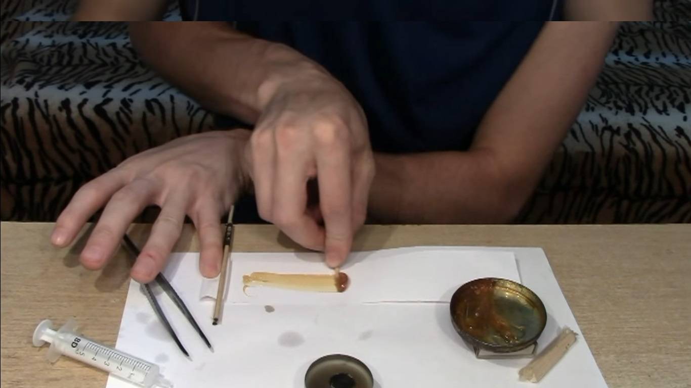 Прежде, чем сделать липучку, надо приготовить смесь, как следует смешав все ингредиенты. Для этого канифоль растапливают на водяной бане. Удобнее всего делать это в жестяной банке, которую после приготовления смеси можно выбросить. Когда вещество полностью растает, в него добавляют остальные компоненты и тщательно перемешивают. Масса должна быть однородной.