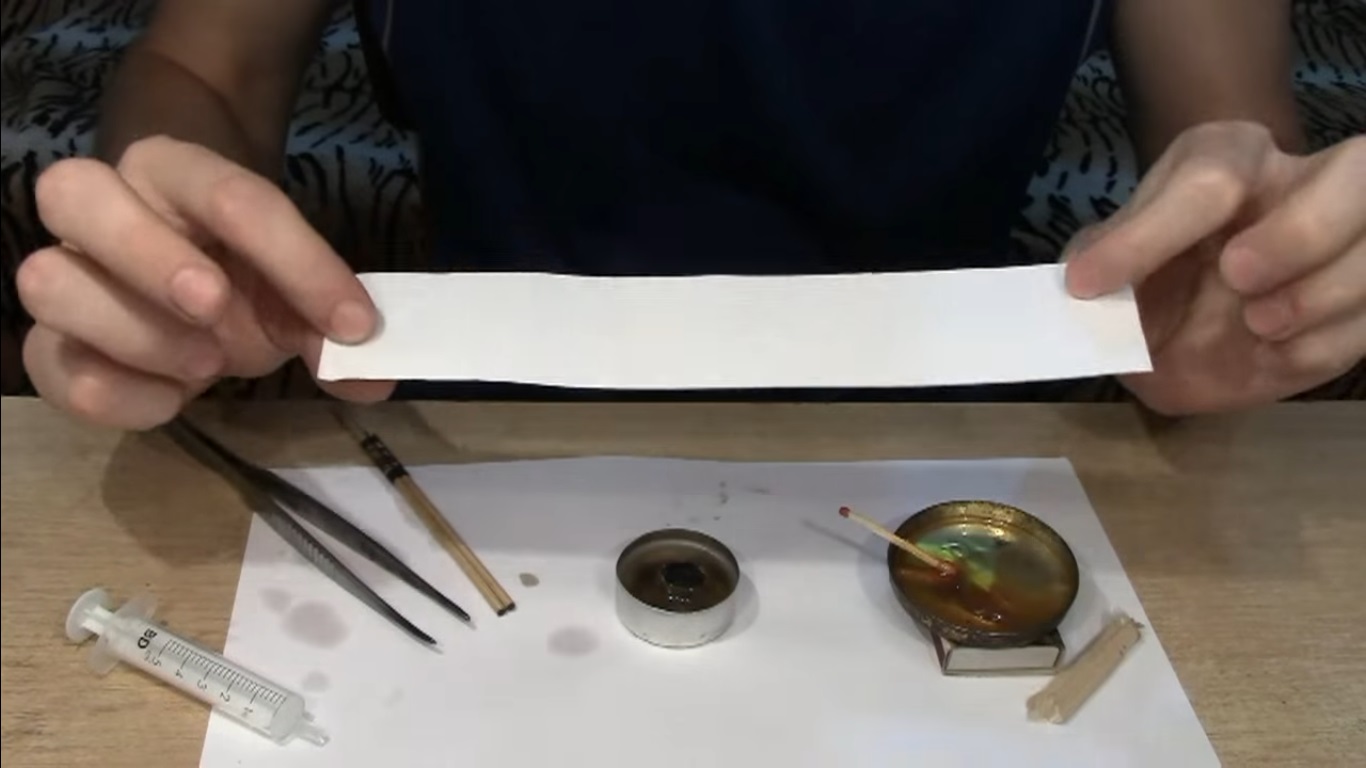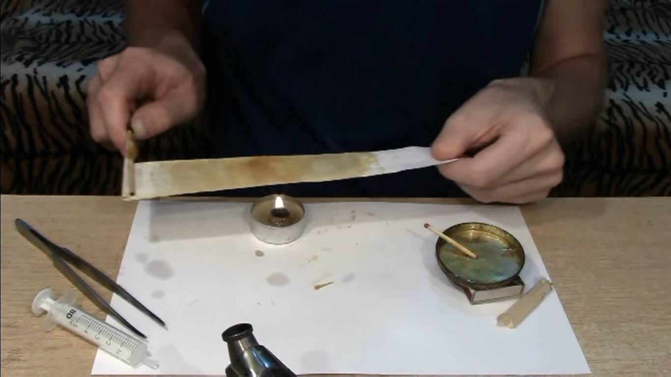 Чтобы добиться максимального пропитывания, ленту необходимо слегка подогреть. Не переусердствуйте и не допускайте контакта огня с бумагой, потому что масло хорошо горит. После прогрева клей пропитается и бумага приобретет желтоватый цвет (изначально будут видны серые участки). Теперь сверните и разверните полоску несколько раз. Чтобы выровнять слой — протяните бумагу сквозь скрепленные палочки, на которые она наматывалась.