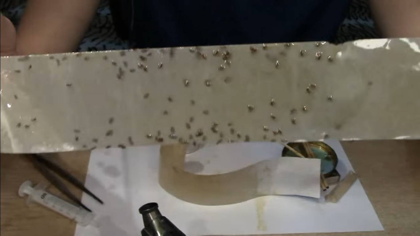 Липкая лента своими руками готова. Если вы все сделали правильно, клей будет прилипать к пальцу и оставлять тонкие нити. Теперь можно повесить липучку в место с максимальным скоплением дрозофил, закрепив его за прищепку. Такая ловушка будет работать не хуже, чем магазинный вариант. Менять можно тогда, когда на ней не останется свободного места или вы будете замечать, что новые мухи в состоянии освободиться.