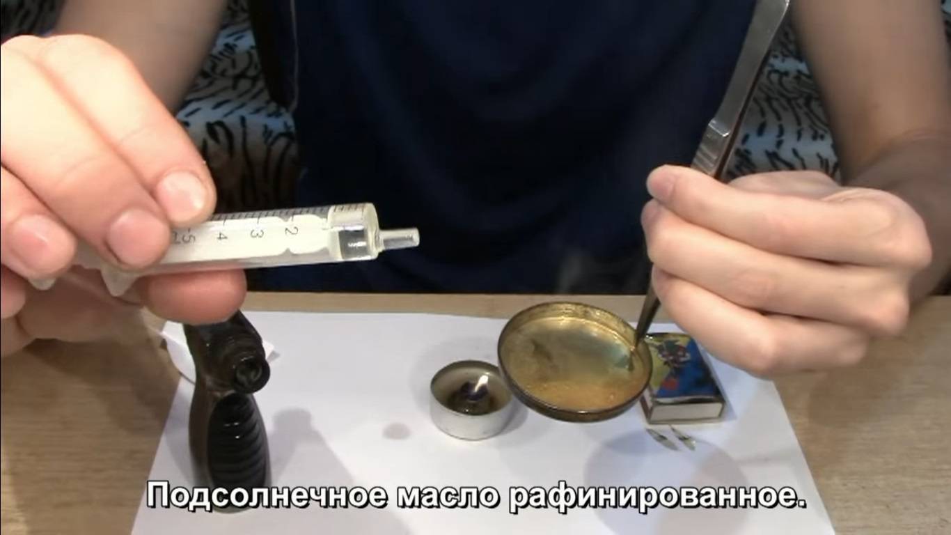 Добавьте в кипящий канифоль масло и грейте смесь дальше еще 30-60 секунд. Касторку можно вылить шприцом. Старайтесь не попасть маслом в огонь, чтобы не обжечь руки или вызвать пожар. Жир хорошо горит.