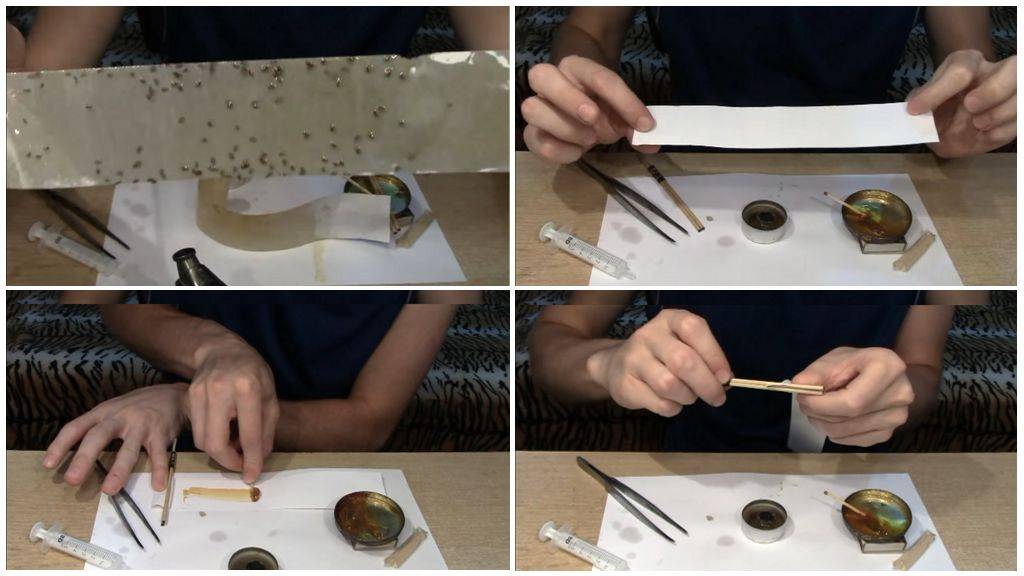 Далее полосу бумаги шириной 5-8 сантиметров пропитывают приготовленной массой с 2-х сторон и подвешивают в местах обитания насекомых. Эффект от использования такой ловушки похож на тот, который получается при выборе покупных вариантов.