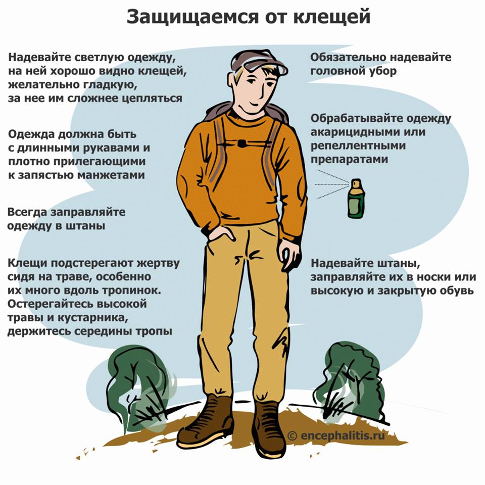 - Отправляясь на природу, оденьтесь правильно: закрытая обувь, высокие носки, в которые заправляются брюки, рубашка с воротом, закрывающим шею, головной убор.