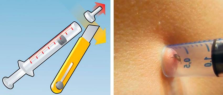 Существует способ удаления паразита и при помощи обычного шприца. Его приобретают в аптеке и обрезают конец, куда вставляется игла. Полученное отверстие приставляют к месту укуса, и тянут за поршень несколько раз. После проведённых манипуляций насекомое само вылазит из ранки.