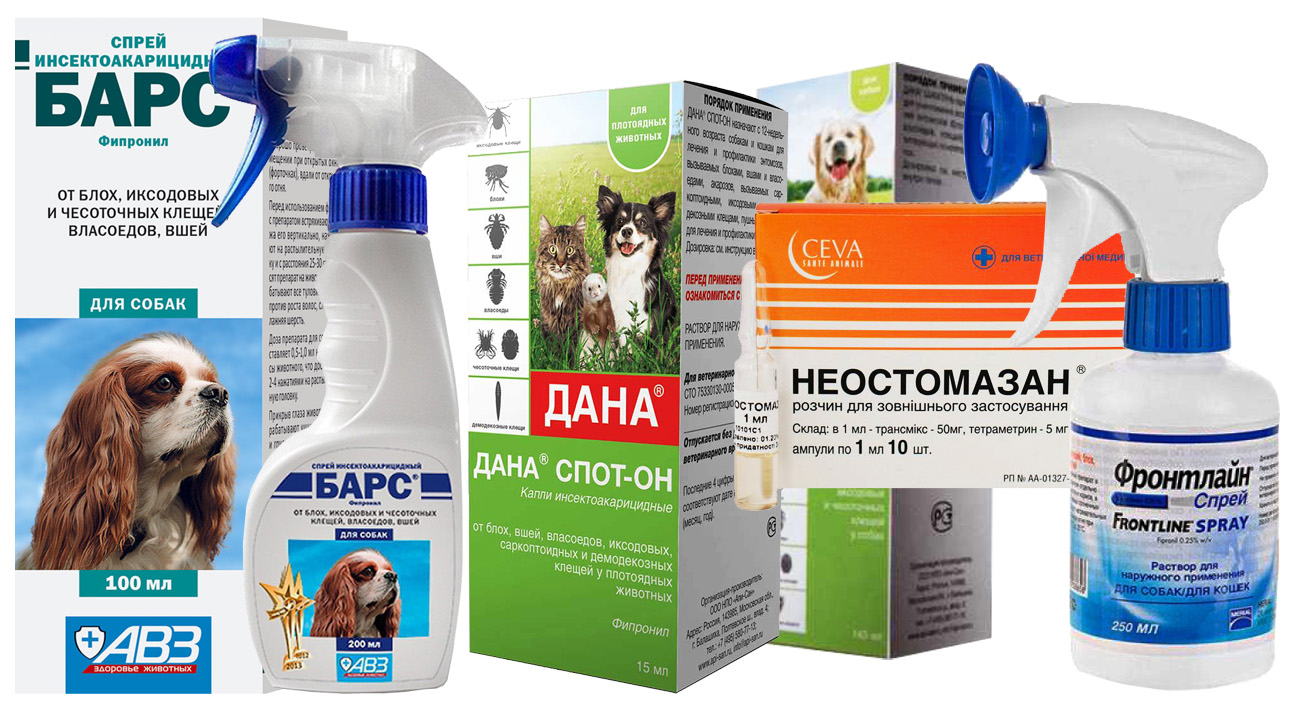 В качестве их используют: спрей «Барс», капли и шампуни «Дана», ампулы для получения растворов «Неостомазан», «Децис», «Фронтлайн».