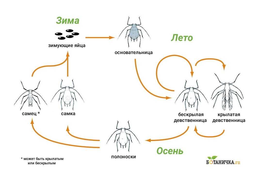 Из перезимовавших яиц развиваются несколько поколений (2-4-8) бескрылых самок, размножение которых проходит без самцов. В июне-июле появляются крылатые формы тлей-расселительниц. Тли, разлетаются, особенно с попутным ветром, до 25 км, расселяются по таким же культурам. Это тли однодомники, а есть еще виды с двудомным циклом развития. Весеннее развитие они начинают на основном хозяине, с появлением крылатых форм на летний период перелетают на рассадники (второй хозяин) – различные травянистые растения, сорняки, овощные культуры и осенью возвращаются для откладывания яиц к основному хозяину. Осенью после спаривания самка тли откладывает оплодотворенные зимующие яйца.