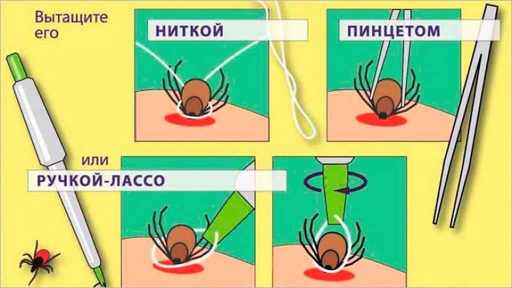 Перед выниманием клеща место укуса обязательно обрабатывают антисептиком – хлоргексидином, этиловым спиртом. Проще всего орудовать медицинским пинцетом. Его можно заменить подручными материалами: