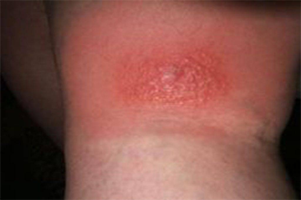 При заражении боррелиозом на месте укуса образуется красное пятно большого размера, вокруг которого по всему контуру на небольшом расстоянии постепенно возникает кайма. Больной может испытывать небольшое жжение в области покраснения, но через несколько дней оно спадает. После чего у человека проявляются такие симптомы как ломота в мышцах, головная боль, слабость. Все это может продолжаться от нескольких дней до месяца. Во второй фазе болезни поражаются суставы и сердечно-сосудистая система.