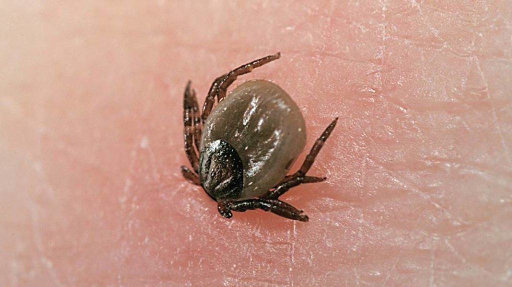 На фото: клещ, недавно присосавшийся к человеку, так как его тело еще не раздуто