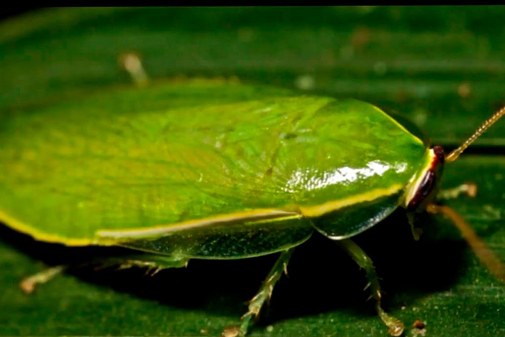 Этот вредитель весь одного цвета, причем он более яркий, чем другие виды – зеленый. Насекомые предпочитают селиться под растительной подложкой, во мхе, гнилой древесине. Питаются на пальмовых плантациях, где селятся после вырубки деревьев. Тараканы любят также цветочный нектар.