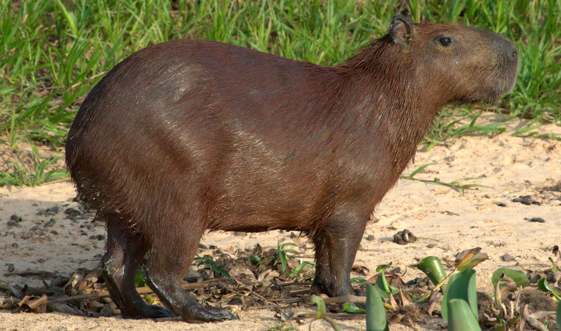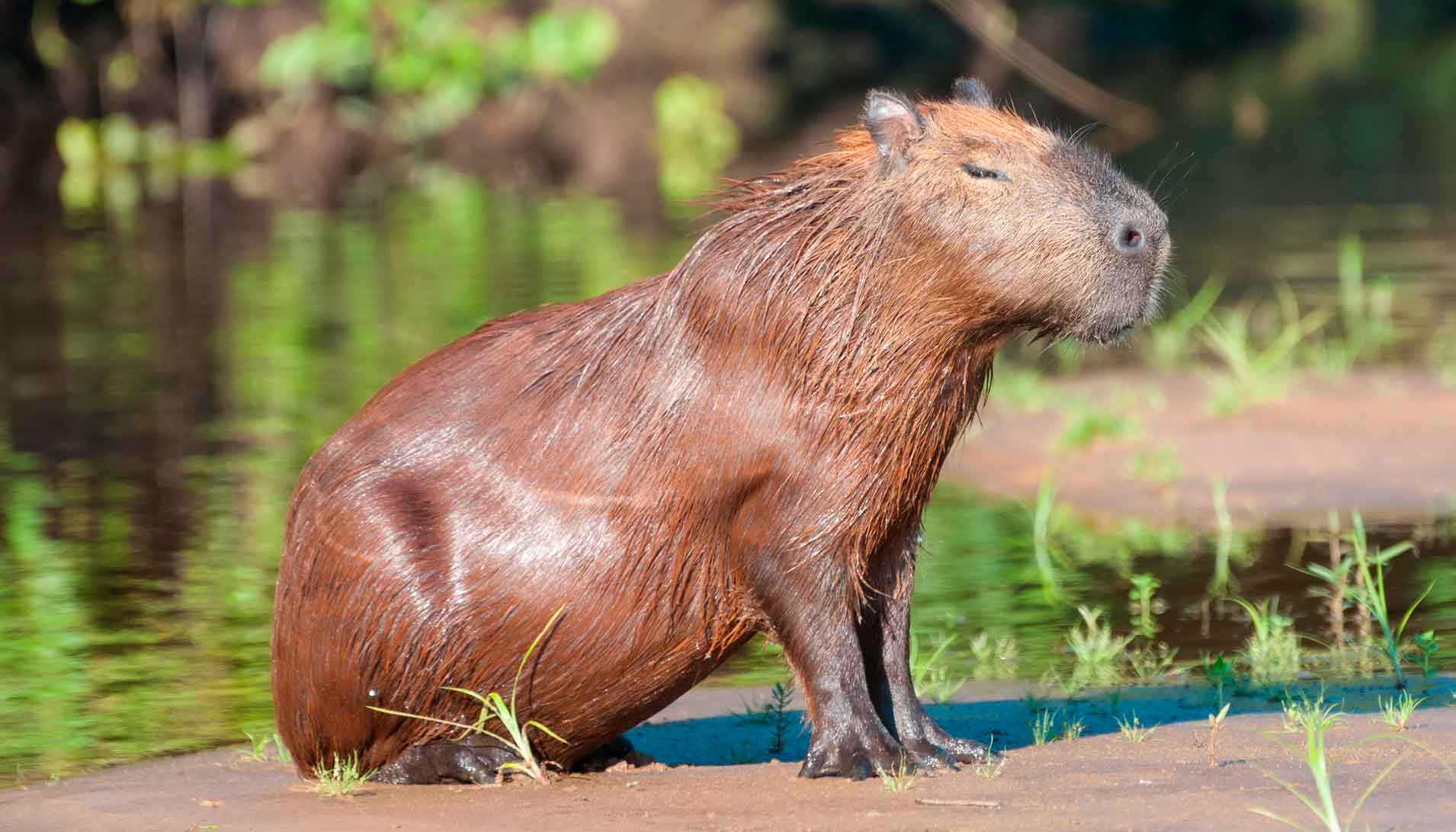 Капибара — самый большой грызун на свете. Внешне она напоминает всем знакомую морскую свинку, только увеличенную во много раз. Капибара вырастает в великана до 60 см в холке и весит около 60 кг.