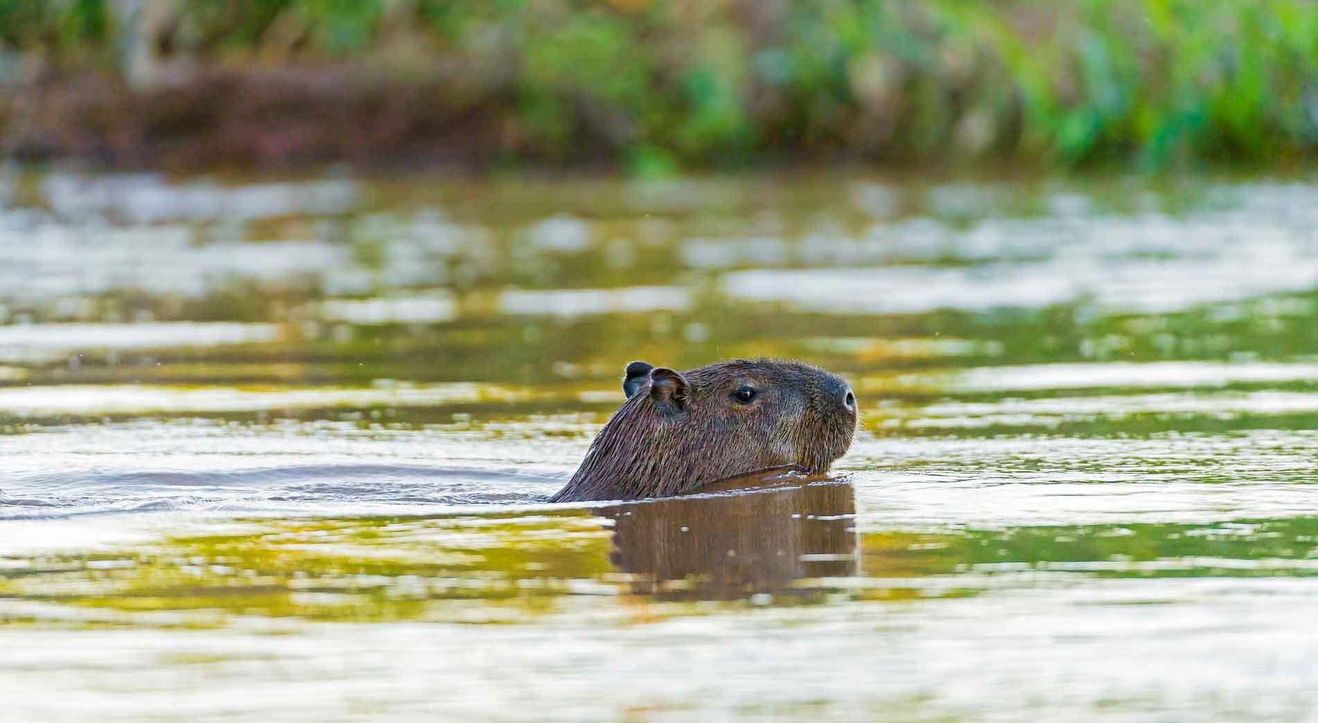- Кожа капибар очень чувствительна к ультрафиолету. Чтобы уберечь себя от солнечных лучей, грызуны вываливаются в грязи или погружаются в прохладную воду, оставляя на поверхности только ноздри и глаза.
