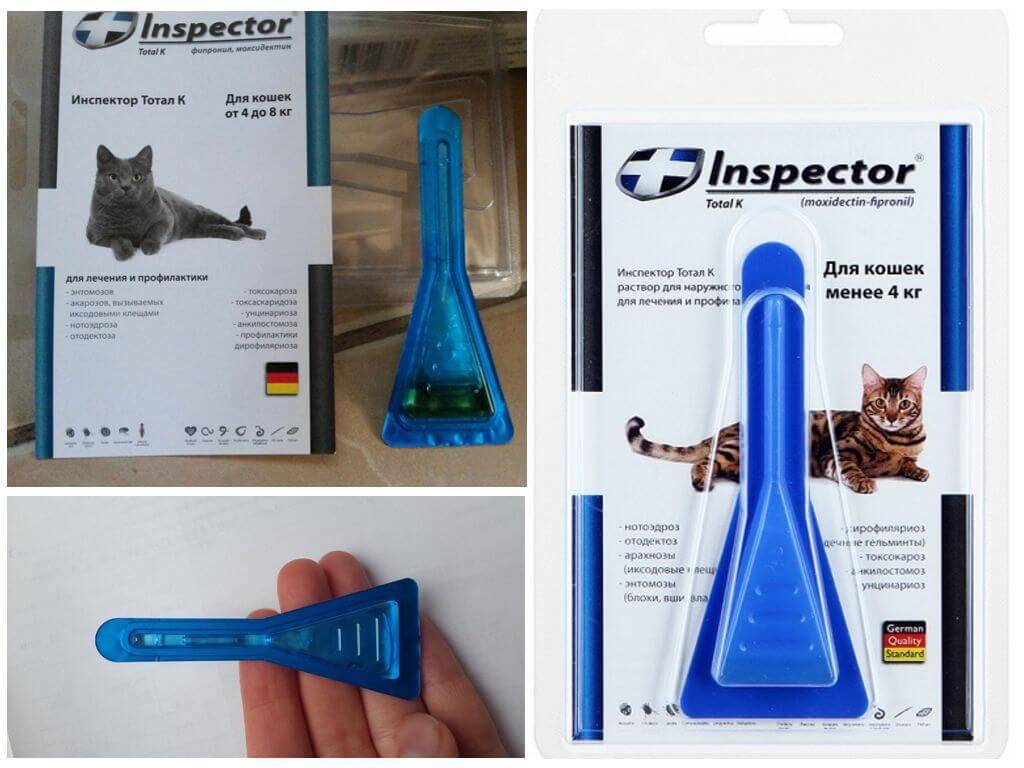 Капли «Инспектор тотал К» — комбинированный противопаразитарный препарат для кошек и собак. Показан к применению при наличии у любимца блох, клещей и гельминтов, а также для профилактики заражения экто- и эндопаразитам.