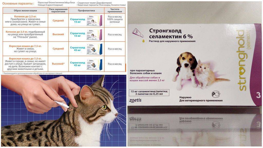 | Стронгхолд | селамектин | токсокароз, наличие блох, власоедов, вшей, анкилостомоз, отодектоз, дирофиляриоз, блошиный дерматит, саркоптоз | мыть кошку можно через 2 часа, пипетки с крышкой | раствор (капли) в пипетках по 0,25, 0,5, 0,75 мл и 1, 2 мл | от 450 рублей за 1 пипетку |