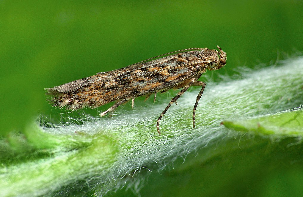 Взрослая моль выглядит как бабочка, достигающая порядка сантиметра в полном размахе крыльев. Окрас его очень ярок: кирпично-красное тело (реже – оранжевое) с белыми пятнами. На теле и ногах в беспорядке «рассыпаны» черные чешуйки. Минирующая моль на фото выглядит вполне симпатичной и безобидной, но внешность, как это часто бывает, обманчива.