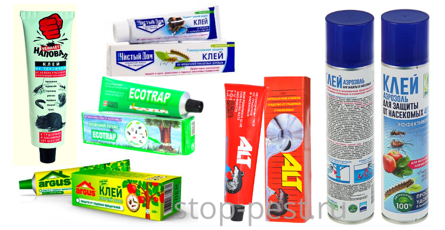 а) Используется готовые клеевые ловушки от насекомых и грызунов (липкая лента от мух, «домик» для тараканов и ползающих насекомых, ловчий пояс для деревьев от муравьев, клеевые садовые ловушки от тли и белокрылки и др.);б) Ловушка самостоятельно изготавливается с применением специального клея от насекомых и грызунов (например, «Чистый дом», «ALT», «Домовой», «Наповал» и др. торговые марки).