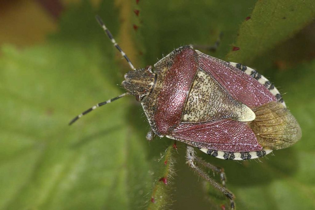 - Ягодный щитник практически незаметен в кустах среди плодов благодаря своей красноватой или бурой окраске . Он высасывает соки из нераспустившихся почек, молодых листьев и ягод. Длина взрослых особей составляет 1-1,2 см. Плоское тело имаго покрыто замысловатым рисунком: сверху – желто-коричневый щит, на брюшке – черный ободок с желтыми полосами, а на черных усах – желтоватые кольца.