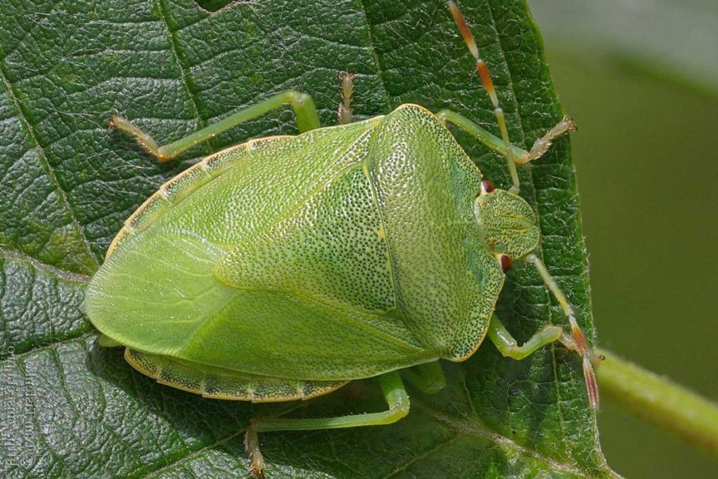 - Имаго древесного щитника окрашены в зеленый цвет. В нижней части спины у них имеется своеобразный коричневый щит. Длина тела составляет 1,1-1,6 см. Древесный клоп селится на лиственных деревьях и кустарниках, сорных и злаковых травах. Если на участке посажена малина, вредитель отдаст предпочтение кустам со сладкими ягодами.