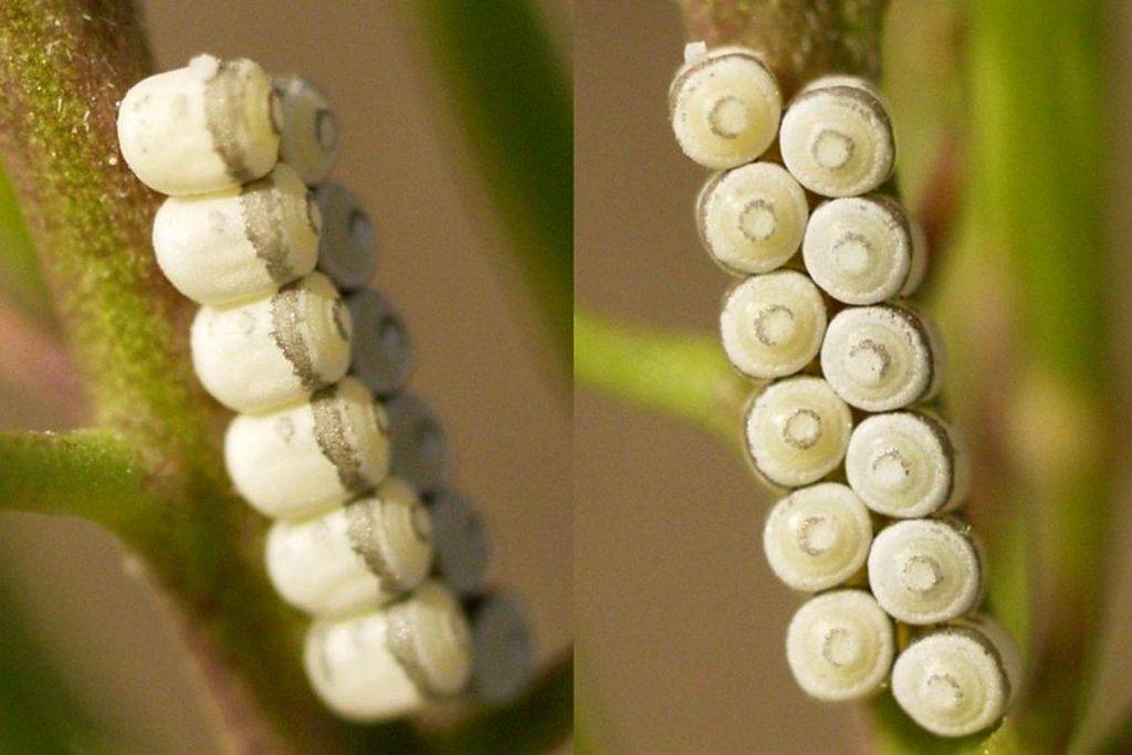 Затем самка откладывает 15–30 небольших жемчужно-белых яиц, у которых наверху имеются крышечки. Открываются они через полторы недели, когда вылупляются личинки.
