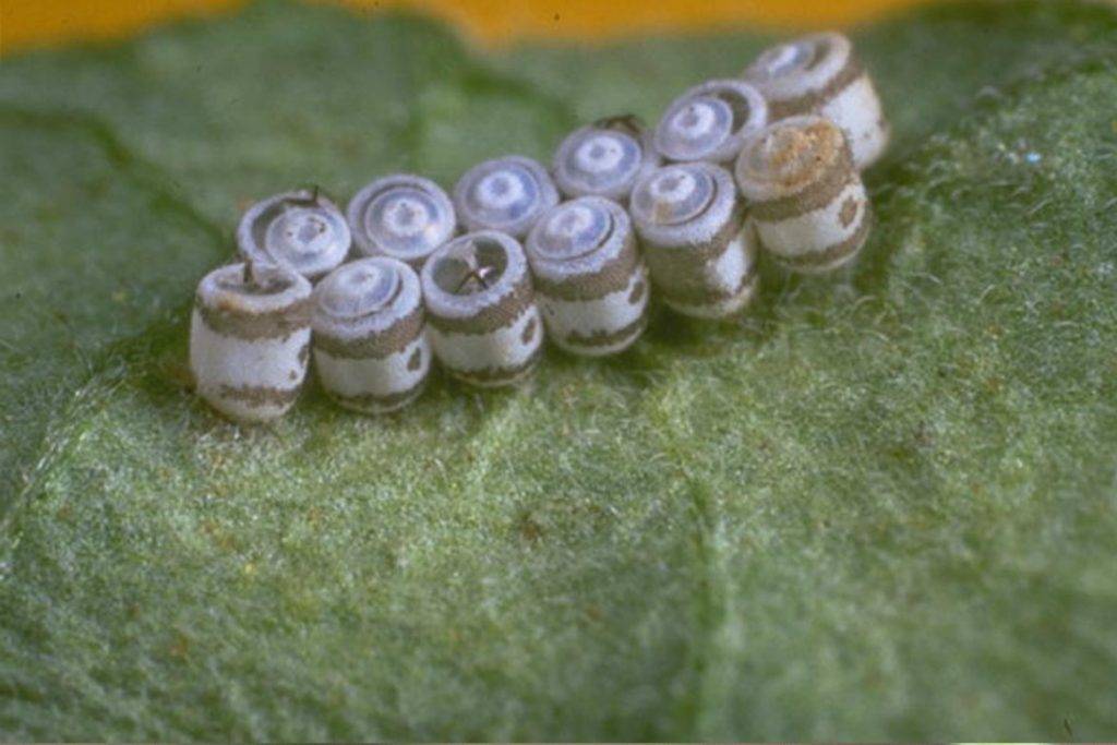 Потомство на первом этапе защищено непроницаемой оболочкой. Яйца характеризуются серым или зеленым цветом. Они по форме напоминают бочонок с крышечкой на одной стороне. На листке можно увидеть до 12 шт. таких образований. Они часто расположены в 2 ряда. На развитие зародышей внутри яиц уходит от 10 до 15 дней. Общее количество в кладке – около 300 шт.