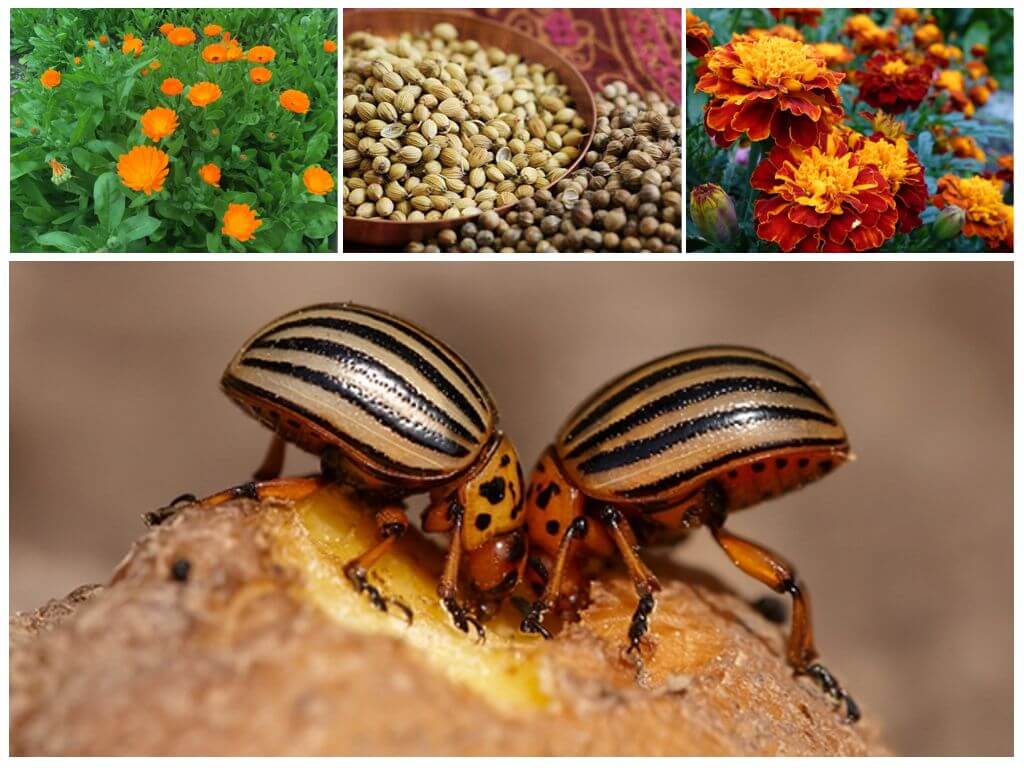 - Для борьбы с колорадскими жуками широко используются и народные методы, основанные на способности вредителя находить пищу по запаху. Для этого практикуется совместная посадка картофеля с сильно пахнущими растениями: календулой, чесноком, бобами или фасолью, перебивающими привлекательный для жука картофельный аромат.