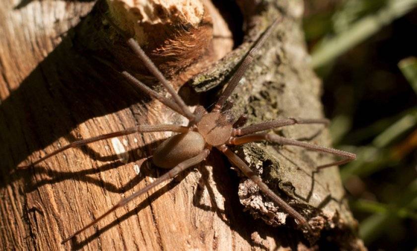 Коричневого паука отшельника несложно идентифицировать по внешнему виду, хотя на фото он чем-то напоминает сенокосца – существо безобидное и страшно пугливое.