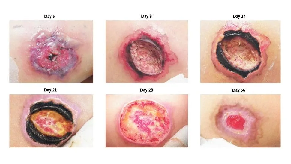 Часто внутри поражения находится язва. Поскольку яд продолжает разрушать ткань, рана может увеличиваться в течение нескольких дней или недель.