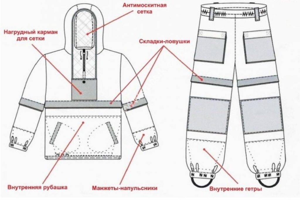 Между слоями может быть дополнительное утепление на случай холодной, сырой погоды. На рукавах манжеты, на штанинах затяжки из шнура. Застегивается куртка на молнию, имеется капюшон, накидная сетка. Некоторые комплекты от комаров укомплектованы перчатками.