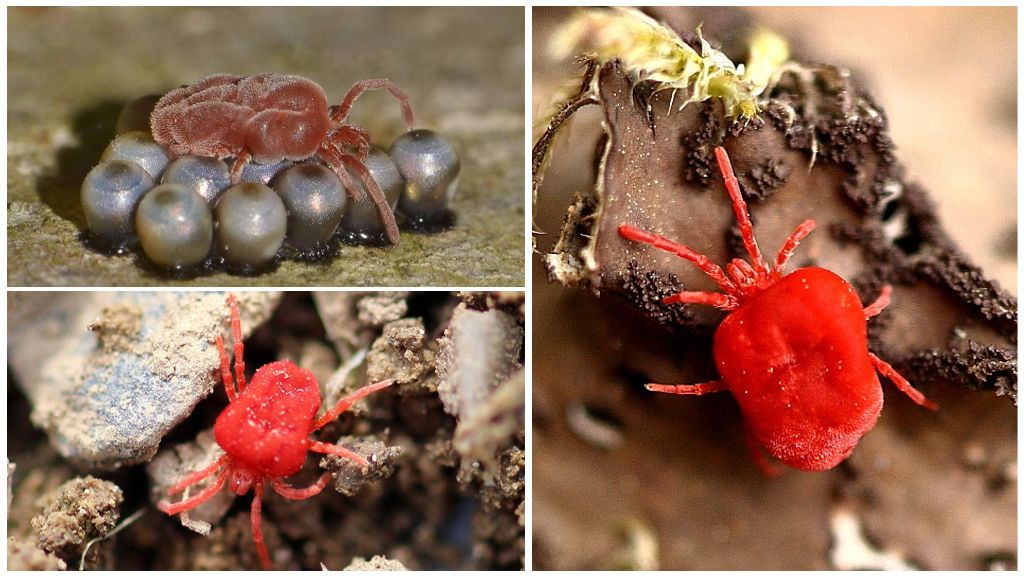 - Личинки красных клещей выглядят как взрослые особи, но меньшего размера, похожи на яркие красные точки и имеют 6 ног вместо 8.