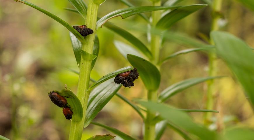 Самый опасный враг лилий – жук-пискун. Но опаснее всего его личинки. Они отличаются большой прожорливостью. Жук и его личинки поедают листья лилий и переносят разные вирусы. Жук-пискун устойчив к различным химикатам, поэтому лучше всего уничтожать его вручную. Будьте внимательны: если жука уронить, то он притворится мертвым, перевернувшись на спину, а так как окрас его брюшка черный, отыскать на земле его трудно.