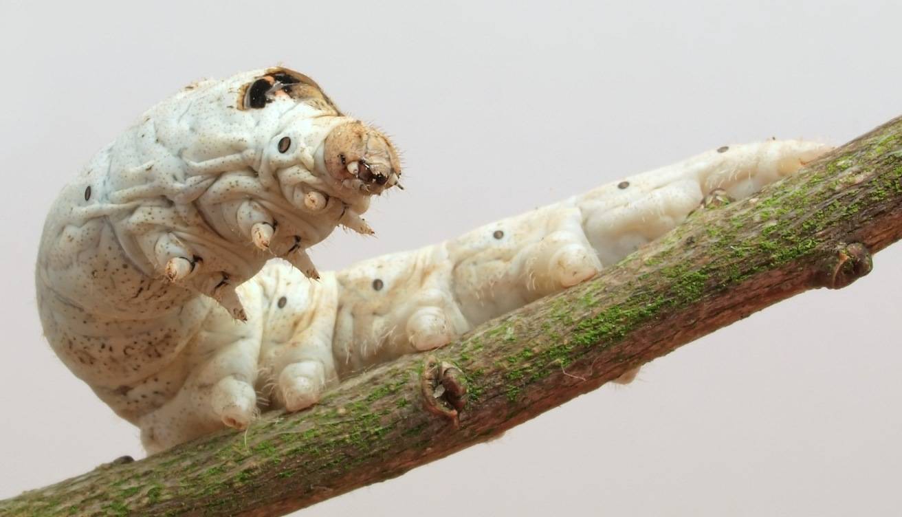 Гусеница тутового шелкопряда (лат. Bombyx mori) или шелковичный червь. Живет в Восточной Азии: на севере Китая и в России, в южных районах Приморья. Длина гусеницы составляет 6-7 см, ее волнообразное туловище густо покрыто синими и коричневыми волосатыми бородавками. После 4 линек, завершающих 32-дневный цикл развития, окраска гусеницы становится желтой. Пища гусеницы тутового шелкопряда – исключительно листья шелковицы. Это насекомое активно используется в шелководстве с 27 века до н. э.