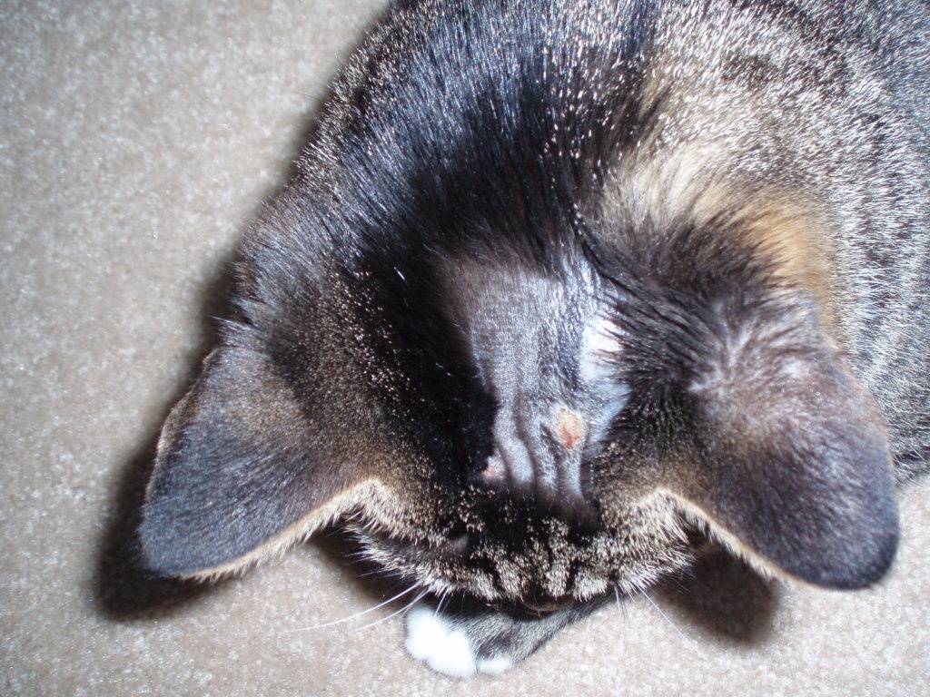 На пораженном участке тела начинает выпадать шерсть вплоть до полного облысения, верхний слой кожи утолщается. На теле могут быть незаживающие язвочки, в которые попадает инфекция. Язвы гноятся, еще сильнее усугубляя состояние питомца. В случае инфицирования у кота начинается лихорадка.
