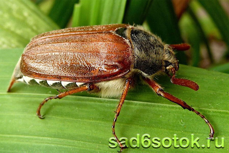 Майский жук – крупное насекомое длиной 3,5-4 см. Тельце покрыто прочным хитиновым панцирем. Длинные надкрылья окрашены в буровато-коричневый, шоколадный или красноватый цвет, сегментированное брюшко и небольшая голова обычно более темные. Туловище и голова покрыты многочисленными волосками, а конец каждой из 6 лапок оснащен загнутым коготком. Края усиков украшены «веерами», состоящими из нескольких длинных пластинок. Взрослые особи (имаго) питаются листвой деревьев и кустарников, цветами и молодыми завязями плодов.
