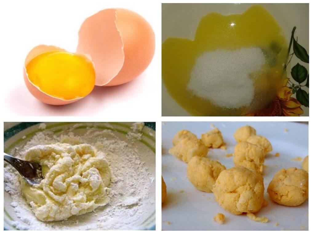 В отдельной ёмкости приступают к смешиванию ингредиентов. Для этого используют яичный желток и 50 г сухого компонента. Их смешивают друг с другом при этом образуя миниатюрные шарики.