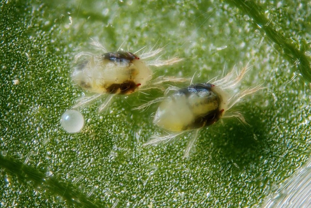 Паутинные клещи и их личинки постоянно обитают на оборотной стороне листа. Там же они и сосут сок, заметно ослабляя растение.