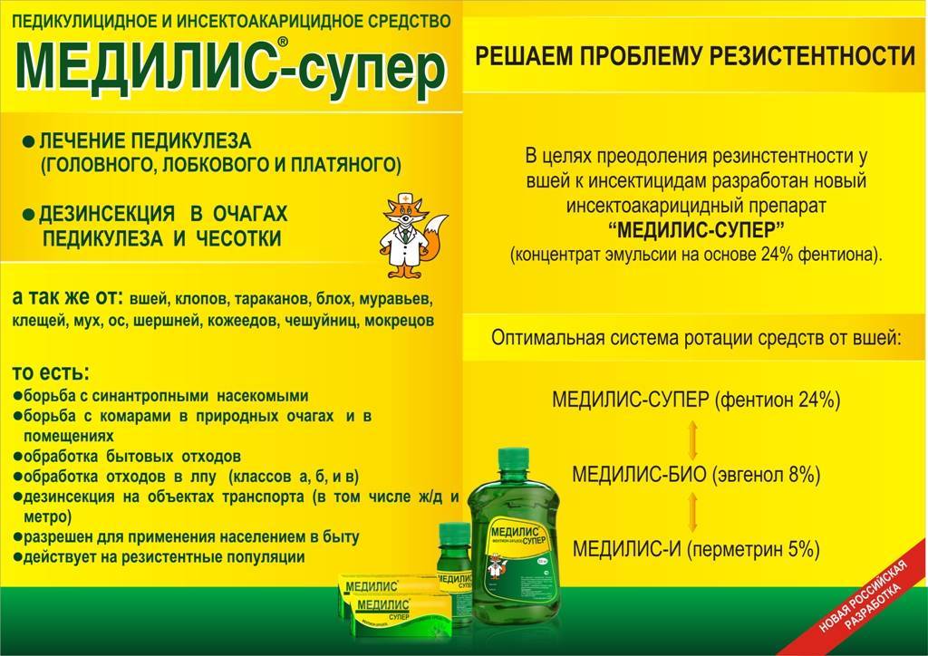 медилис-СУПЕР – педикулицидное и инсектоакарицидное средство в одном флаконе.