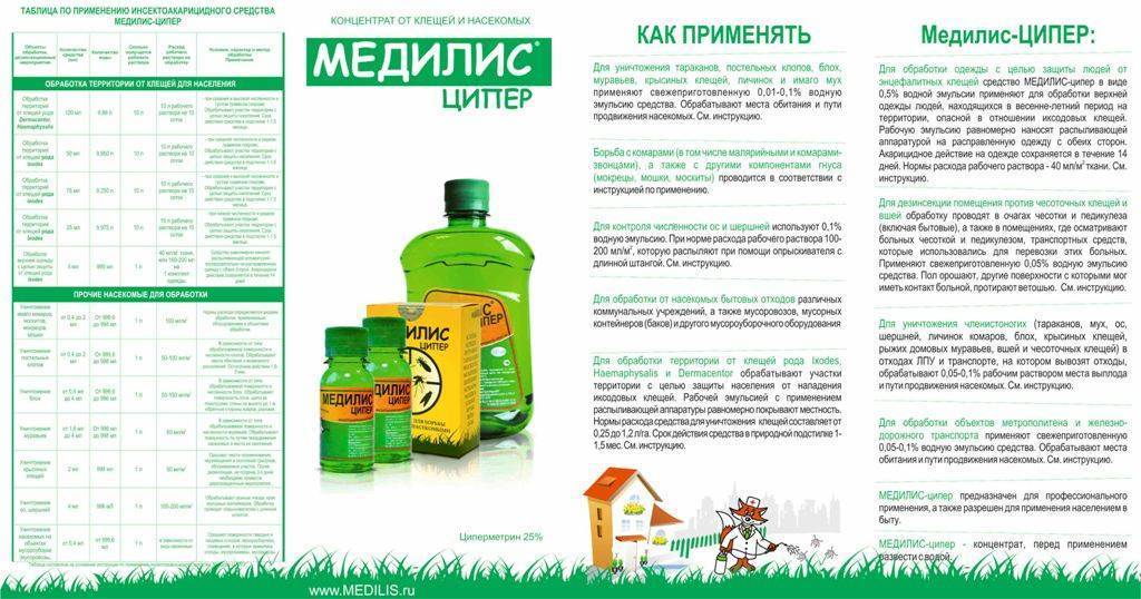 В ней указано, как правильно разводить Медилис для уничтожения того или иного паразита. Также описываются правила использования в закрытых помещениях и на садовых участках.