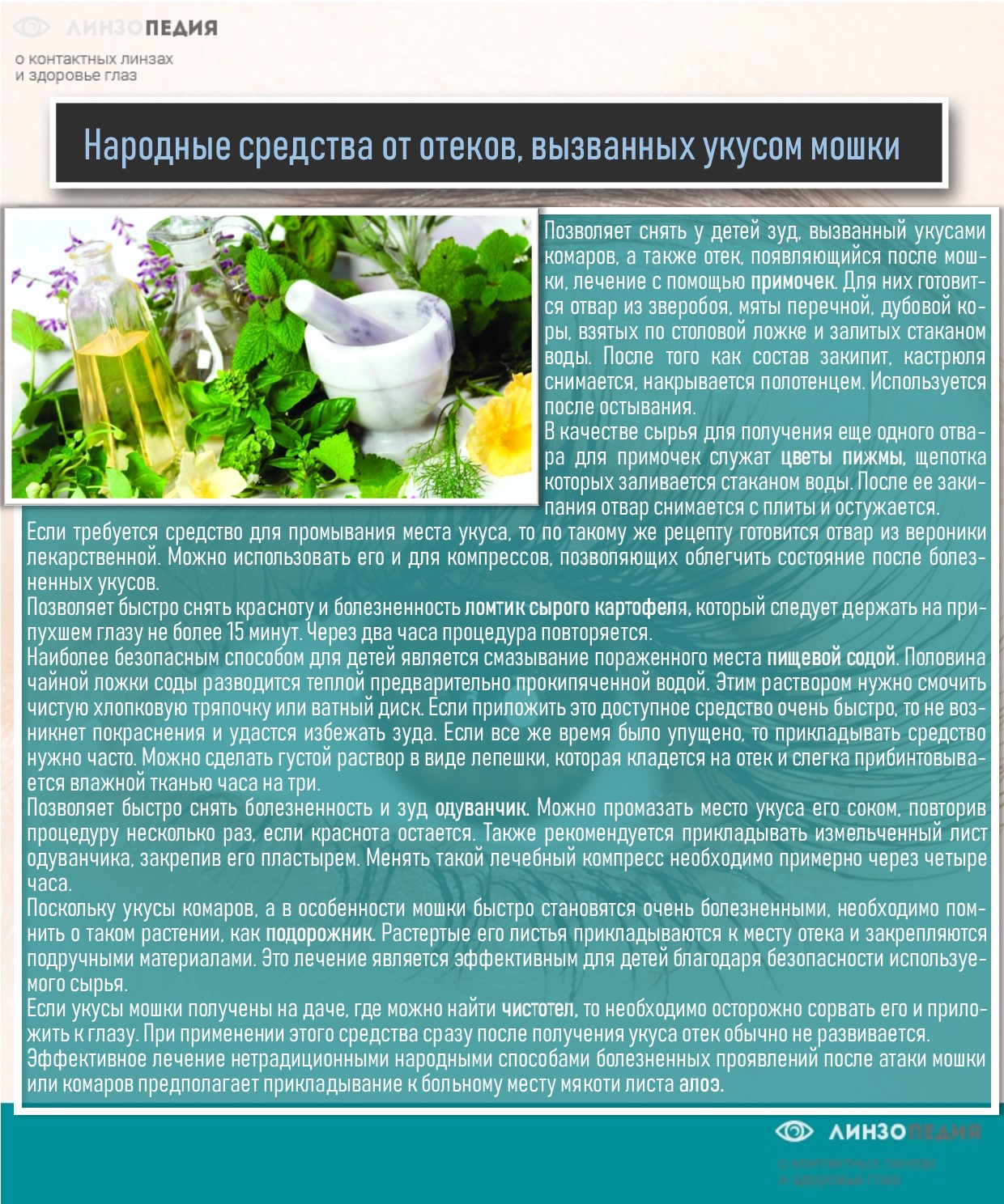 В народной медицине существует много различных рецептов, используемых для устранения отечности тканей, которая возникает после укуса мошки. Также их можно использовать в качестве дополнения к медикаментам.