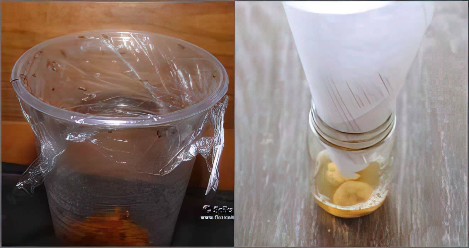 При желании можно сделать другую простую ловушку для мушек-дрозофил. Для этого понадобится глубокий стаканчик и пищевая пленка. На дно тары нужно положить немного кусочков фруктов или налить сок. Далее верхнюю часть стакана прикрывают пищевой пленкой.