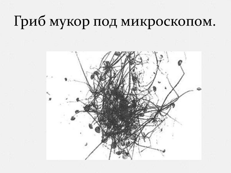 Под микроскопом хорошо заметно, что грибница плесневого гриба состоит из тонких бесцветных нитей. Многочисленные нити — это одна сильно разросшаяся клетка.