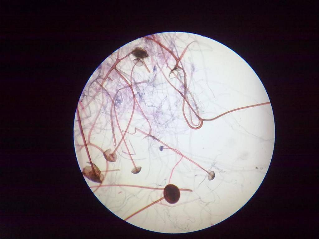Рассмотреть особенности строения мукора можно только при помощи мощного увеличительного средства – микроскопа. Под его стеклом грибок напоминает швейную подушечку, сплошь утыканную булавками. За это представителей рода Мукор нередко называют Головчатой плесенью.