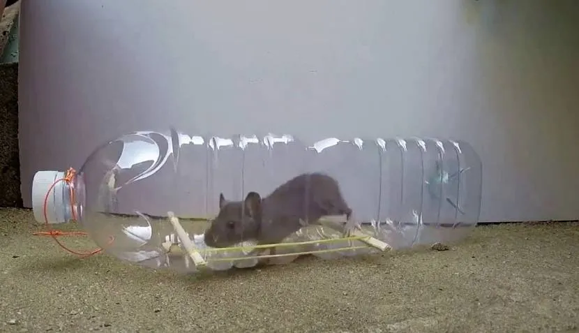 Смысл ловушки заключается в том, что мышь, проникнув в бутылку – побежит к наживке. Оказавшись в задней (свисающей части), накренит ёмкость, она наклонится и полетит вниз. Упасть бутылке не позволит шнурок – так ловушка окажется подвешенной в воздухе, а выбраться наружу грызун не сможет из-за узкого отверстия.