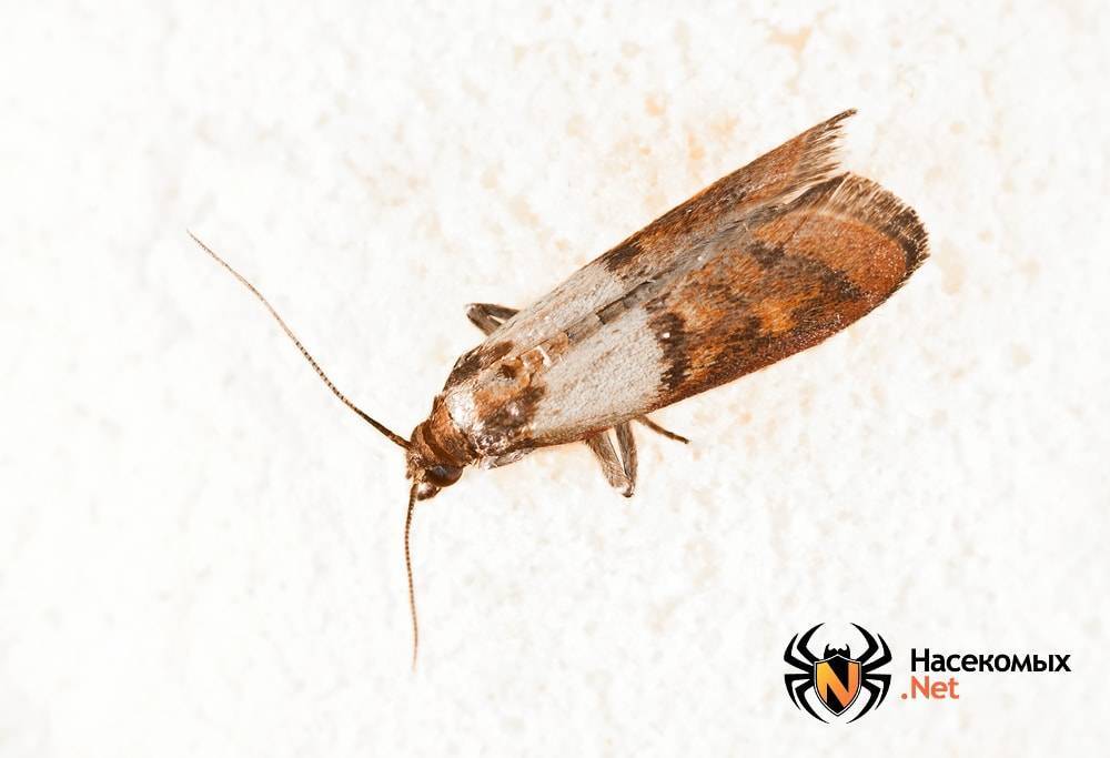 Мельничная моль. Бабочка размером до 1,5 см, с темно-серыми в точках крылышками. В квартире этот вид огневки встречается редко, обычно они подселяются на мельницах.