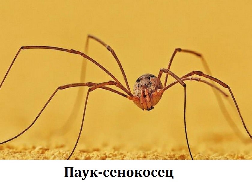 Одними из самых распространенных являются пауки-сенокосцы или долгоножки. Они распространены повсеместно и часто обитают в домах и квартирах. Всего их насчитывается более одной тысячи видов. Обычно долгоножки имеют размеры от 2 миллиметров до 1 сантиметра. Некоторые виды, обитающие в лесах, могут достигать 5 сантиметров. Характерной особенностью сенокосцев является исключительная длина ног, которая в 20 раз может превышать размеры тела. Данное семейство пауков не опасно. Человеку сенокосцы приносят пользу, поскольку избавляют жилище от разных насекомых.