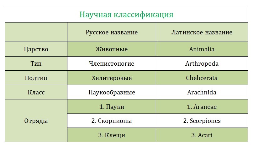 Таблица «Научная классификация паукообразных»