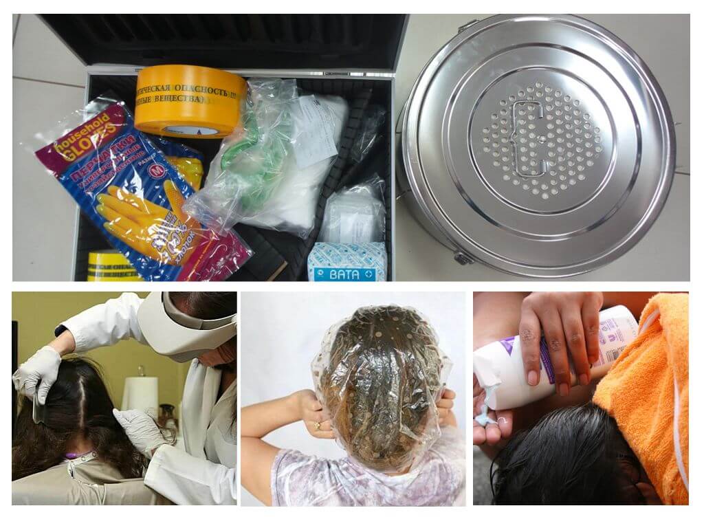 Волосы пациента обрабатываются. Для этого используются противопедикулезные средства, имеющиеся в составе укладки. После этого на голову надевается шапочка. Через 20 минут локоны промываются шампунем из набора. Высушенные волосы прядь за прядью расчесываются частым гребнем. Завершение процедуры предусматривает следующие этапы: