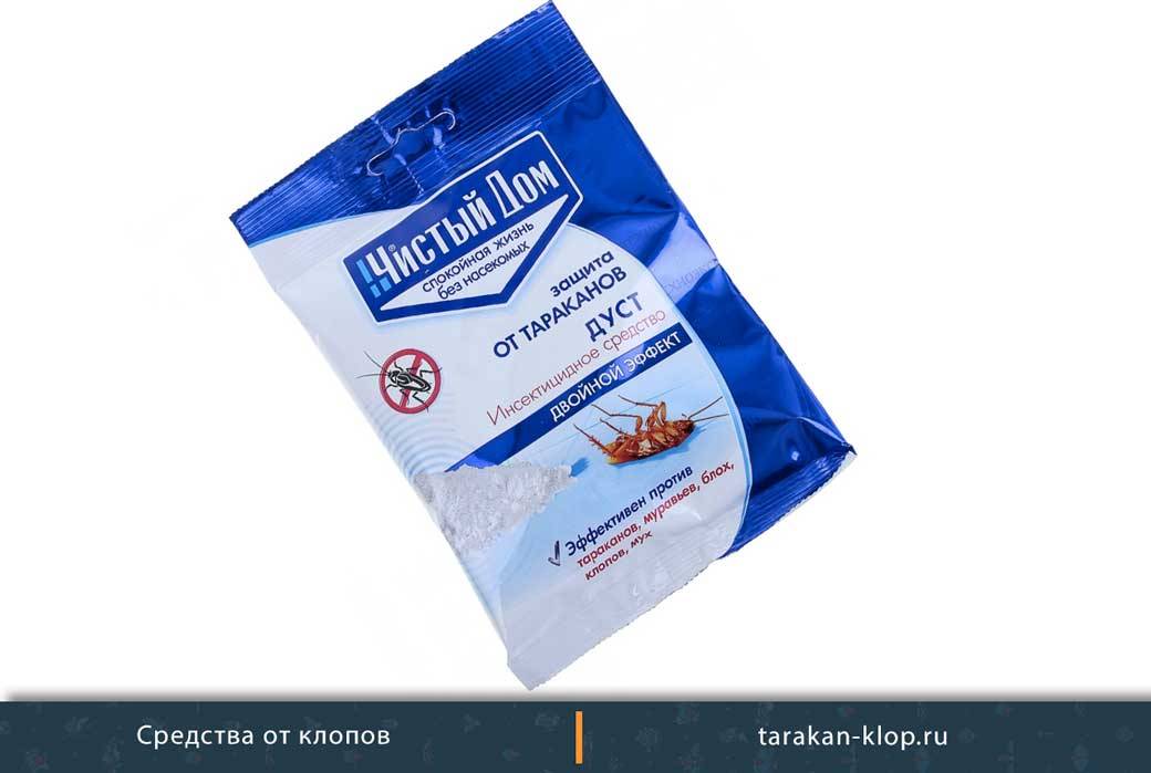 Дуст Чистый дом от клопов. Одно из самых надежных средств, которое используется даже дезинсекционными службами. Способ его применения простой – порошок рассыпают там, где кровососов больше всего. Одной упаковки дуста весом 50 граммов хватит для десятиметровой комнаты. Продается в хозяйственных магазинах, а также торговых точках для садоводов. Стоит пакетик всего 15 рублей. Отзывы про дуст Чистый дом от клопов почти все хорошие, но есть и недостаток: уничтожить яйца насекомых он не сможет.