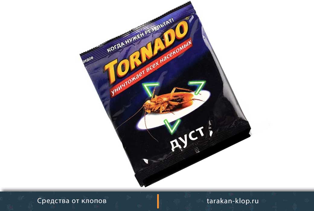Торнадо – универсальное средство российского производства, реализуемое упаковками по 150 граммов. Активными веществами являются борная кислота и циперметрин. Стоимость упаковки составляет 70 рублей. Перед использованием нужно почитать в инструкции, как разводить дуст и в каком количестве надо использовать средство. Практически каждый отзыв о дусте Торнадо подтверждает, что после одной-двух обработок с насекомыми удается справиться.