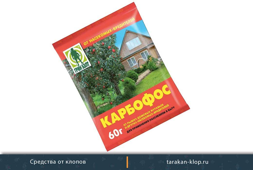 - Карбофос – эффективное средство, которое быстро помогает избавиться от насекомых. Продается как в виде жидкости, так и в порошке весом 30 и 60 граммов. 60-граммовый пакетик может стоить от 40 до 60 рублей.