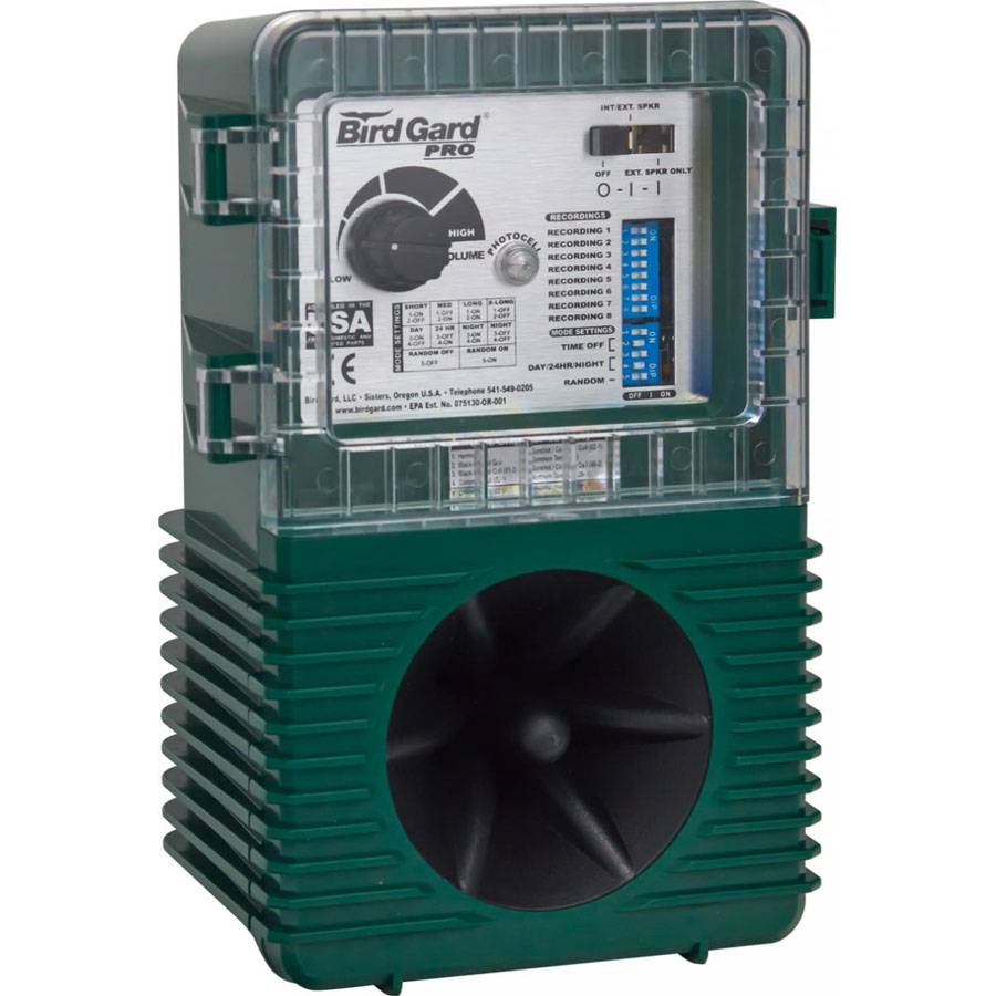 Bird Gard Pro Plus — биоакустический отпугиватель птиц американского производства, предназначен для промышленных отраслей. Для проигрывания звуков в комплект входят два выносных звукоизлучателя. Есть возможность сохранить в памяти до 8 записей.